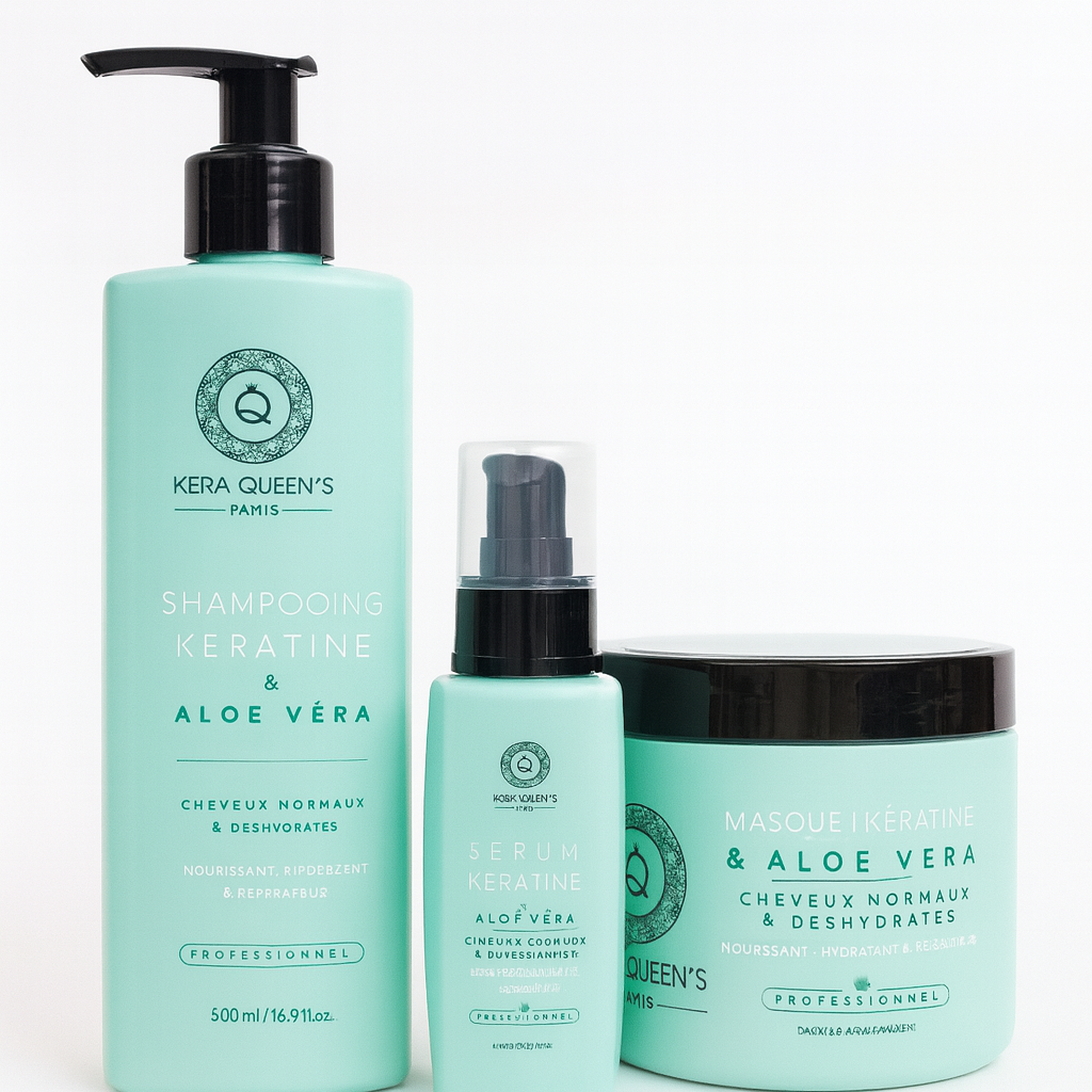 Kit Soin Kératine & Aloe Vera – Shampoing, Masque et Sérum Professionnels pour Cheveux Normaux & Déshydratés