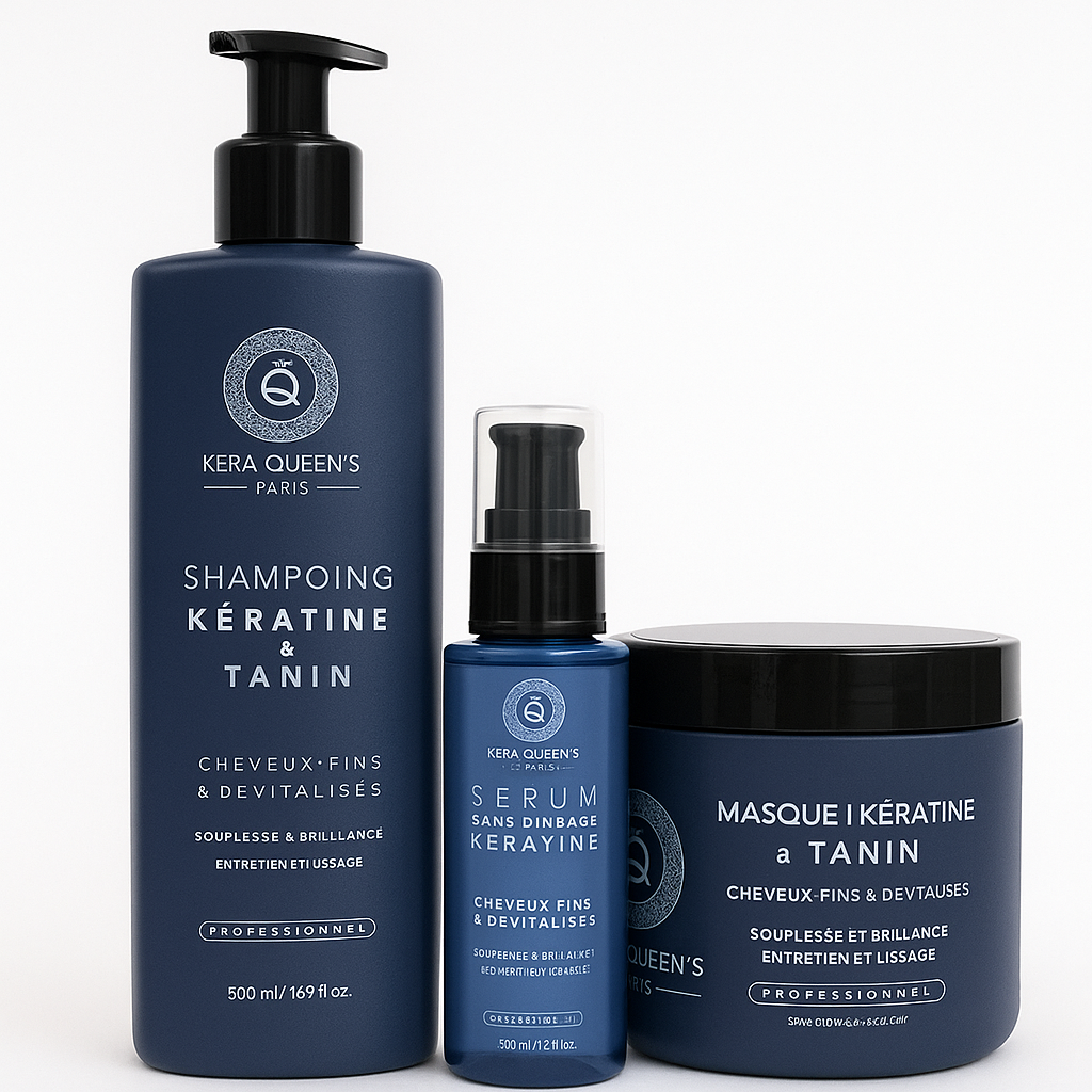 Kit Soin Kératine & Tanin – Shampoing, Masque et Sérum Professionnels pour Cheveux Fins & Dévitalisés